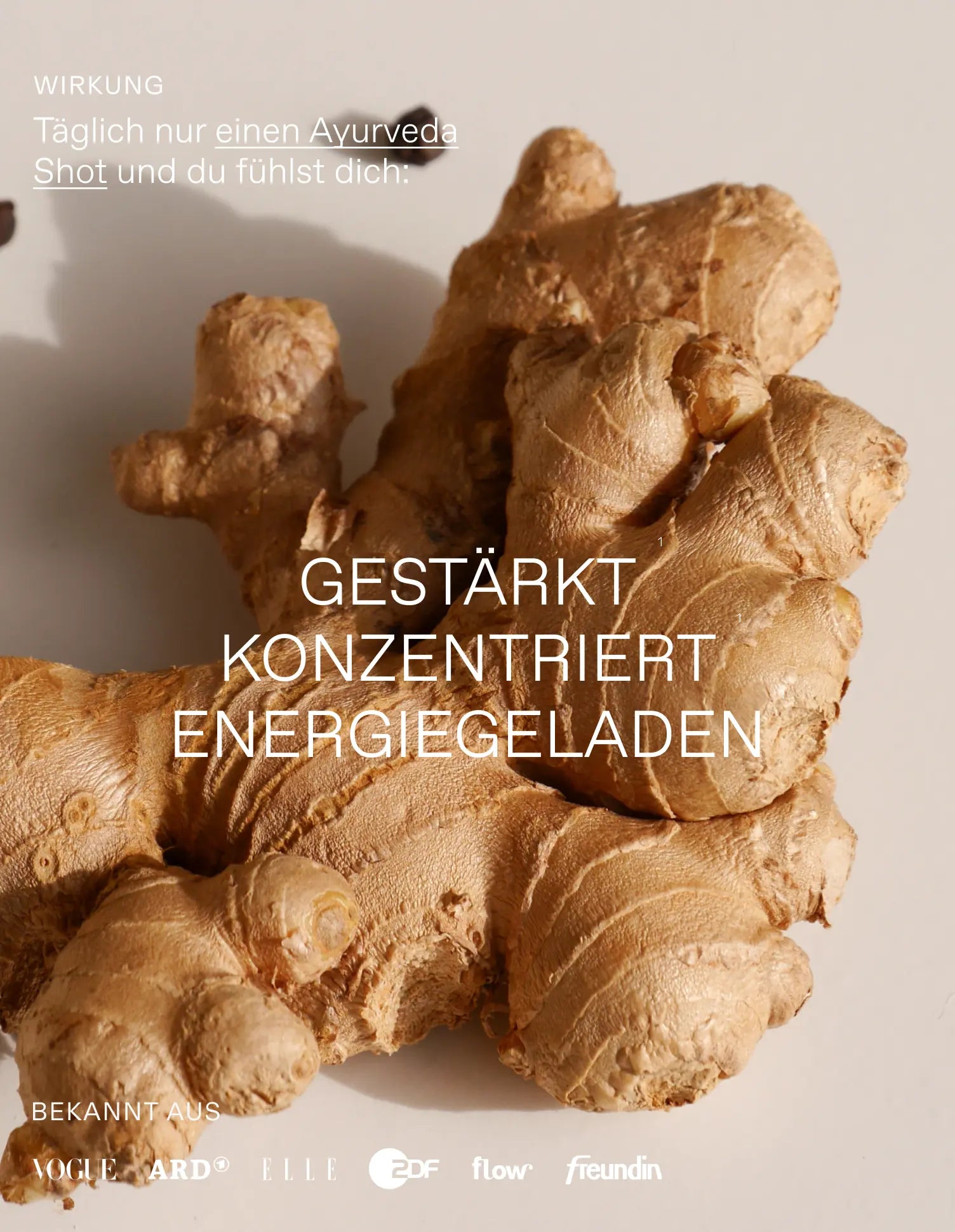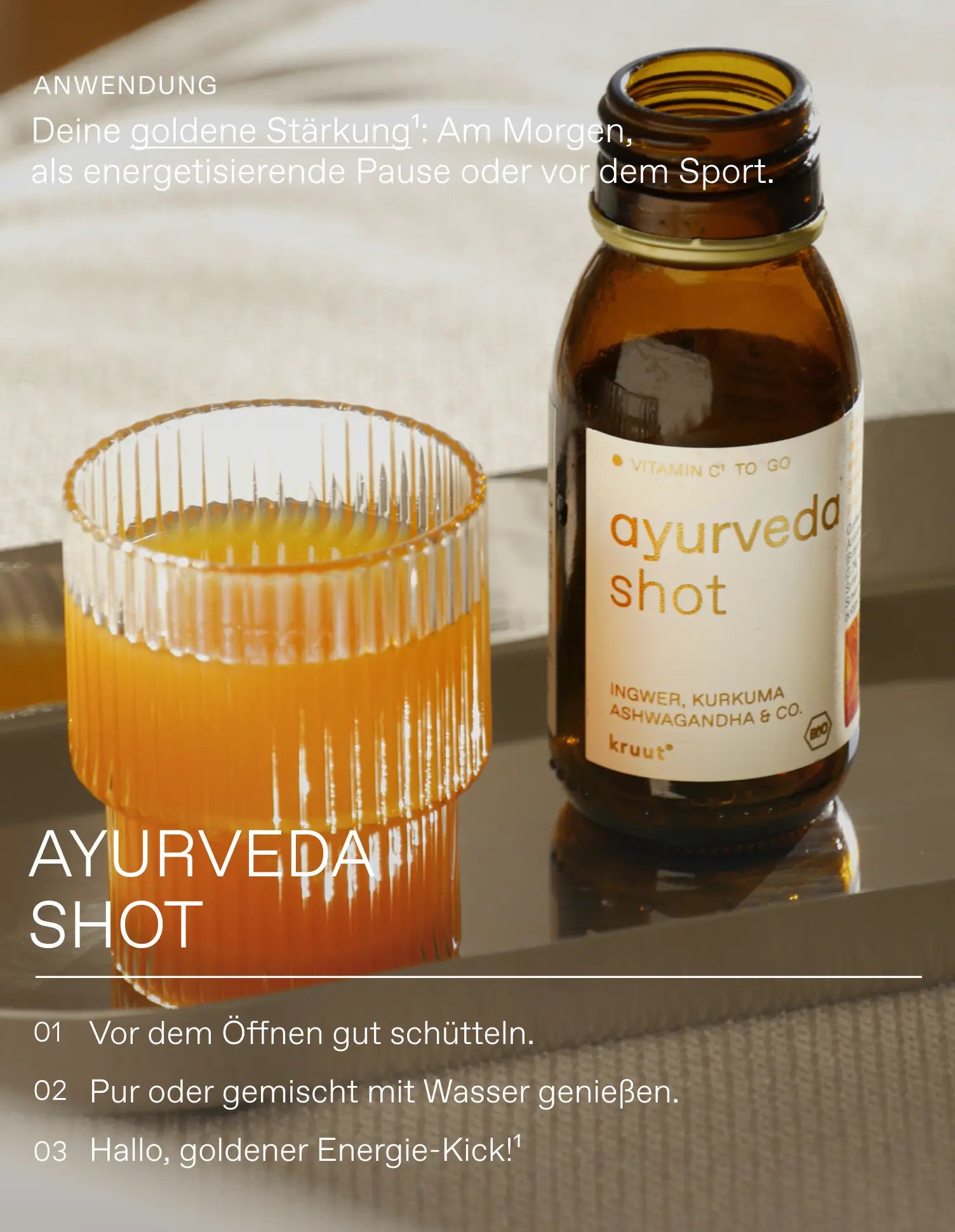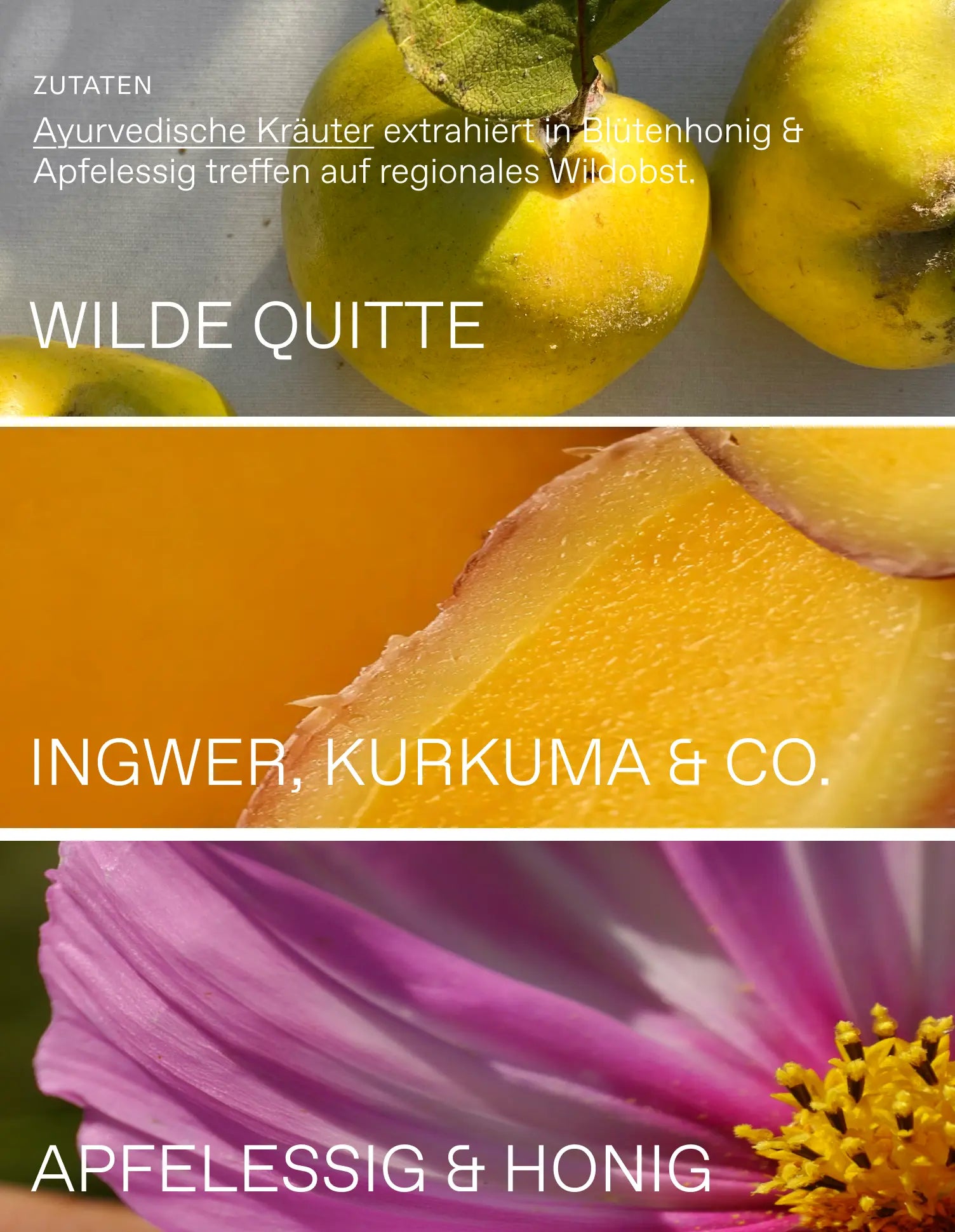 Schütteln & genießen. So einfach holst du dir die Kraft ayurvedischer Kräuter in den Alltag. In unseren Shots kombinieren wir unser hochkonzentriertes Elixier – das Ayurveda Oxymel aus stärkenden Kräutern wie Ingwer, Kurkuma und Ashwaganda –mit fruchtigem Quittensaft aus Deutschland und frischem Quellwasser. Dein ganzheitlich-wohltuendes Energie-Ritual!