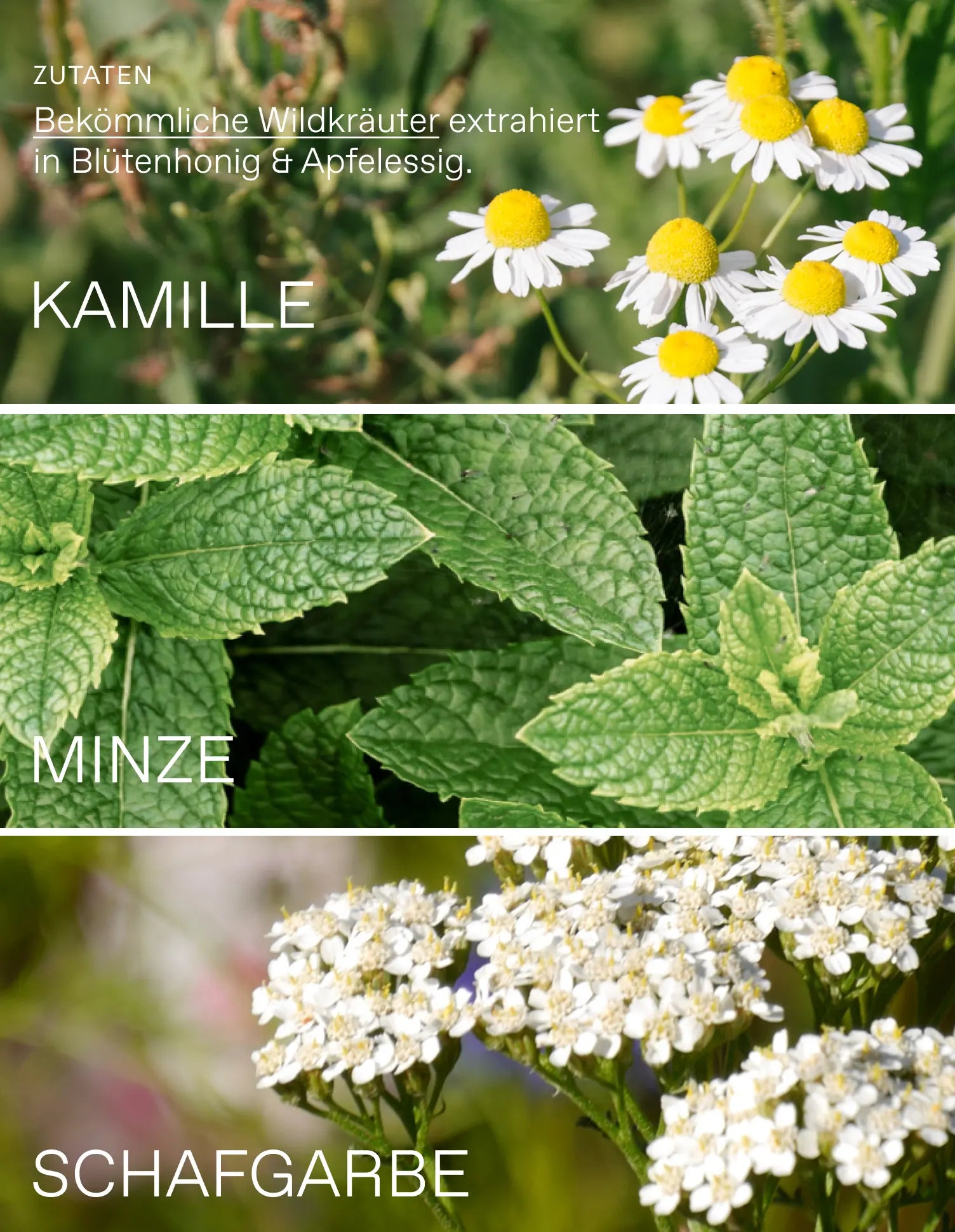 Zutatenverzeichnis. 100% bio: Blütenhonig, naturtrüber Apfelessig, Kamille, Pfefferminze, Schafgarbe, Wiesenkümmel