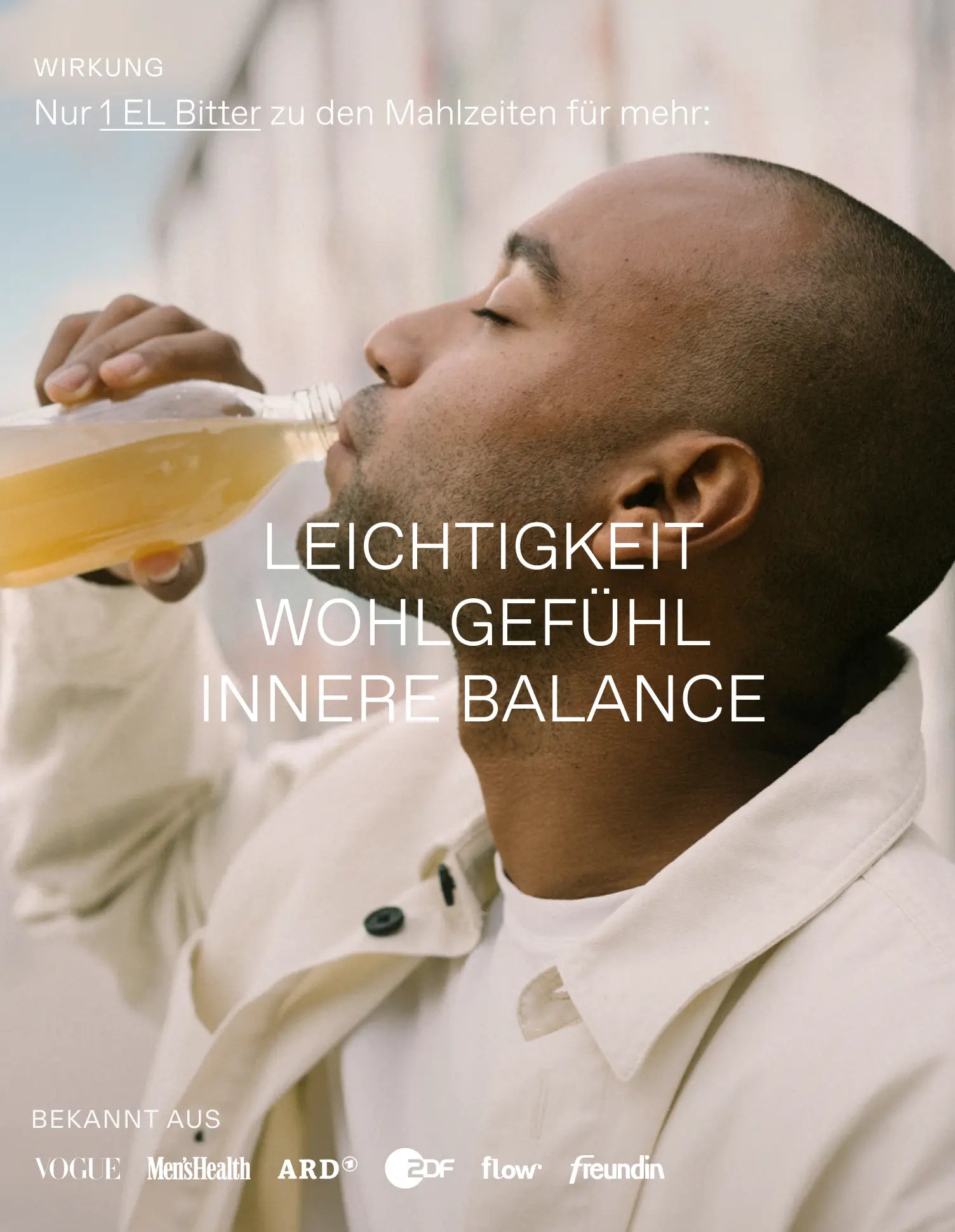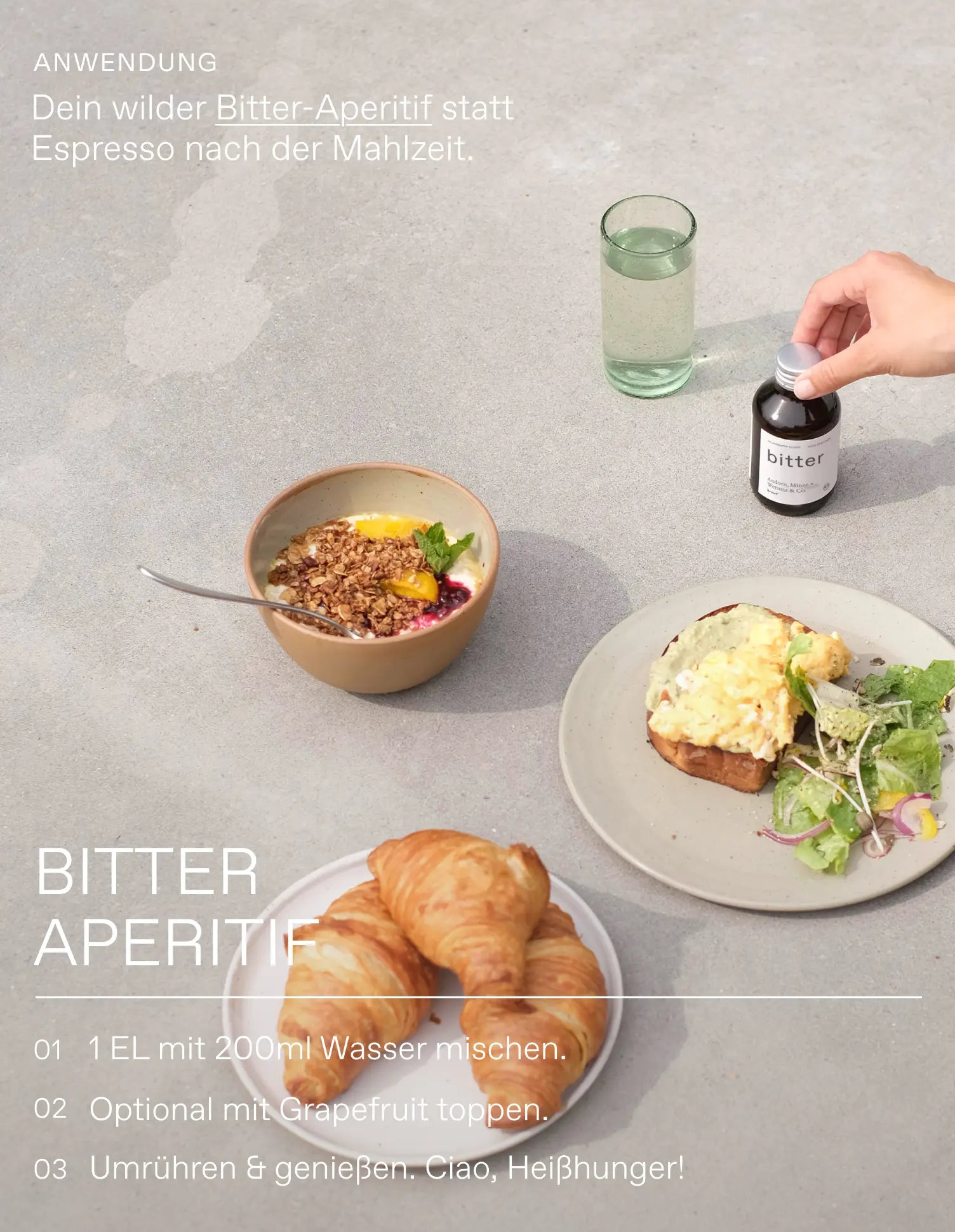 Situation. Statt Espresso nach der Mahlzeit. Aber auch ideal vor dem Essen oder als erfrischende Limonade mit Eiswürfeln und Minzblättern. Hol dir Bitterstoffe zurück in den Alltag!