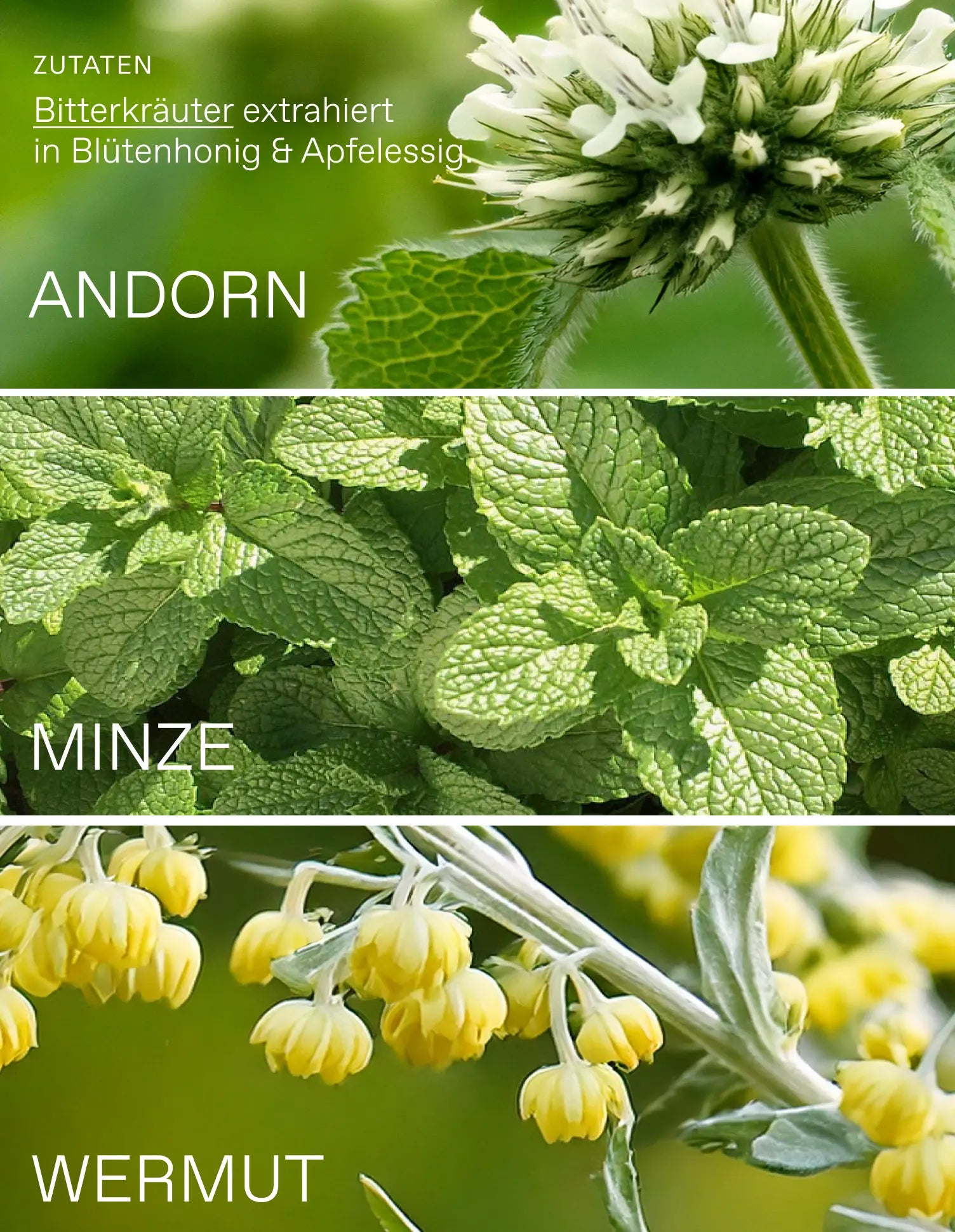 Zutatenverzeichnis. 100% bio: Blütenhonig, naturtrüber Apfelessig, Wermut, Tausendgüldenkraut, Andorn, Pfefferminze