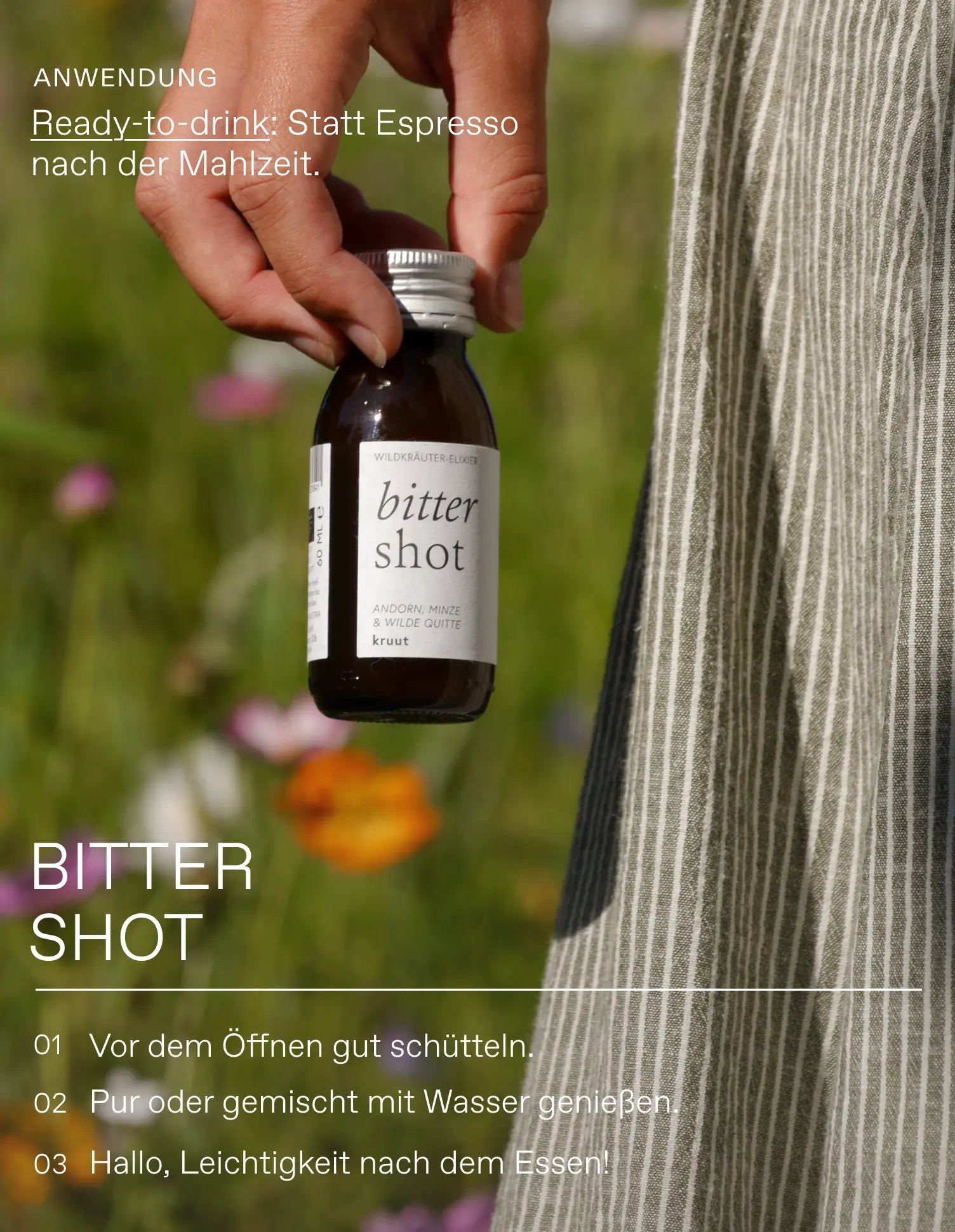 So gut kann bitter schmecken! Der fruchtig-bittere Wildkräuter-Shot ist dein Begleiter zu jeder Mahlzeit. In unserem Shot kombinieren wir unser hochkonzentriertes Elixier, den Bitter Oxymel aus Minze, Andorn und Wermut, mit wildem Quittensaft aus Norddeutschland und frischem Quellwasser. Ab jetzt heißt es 100% frische Bitterkräuter statt Espresso nach dem Essen!