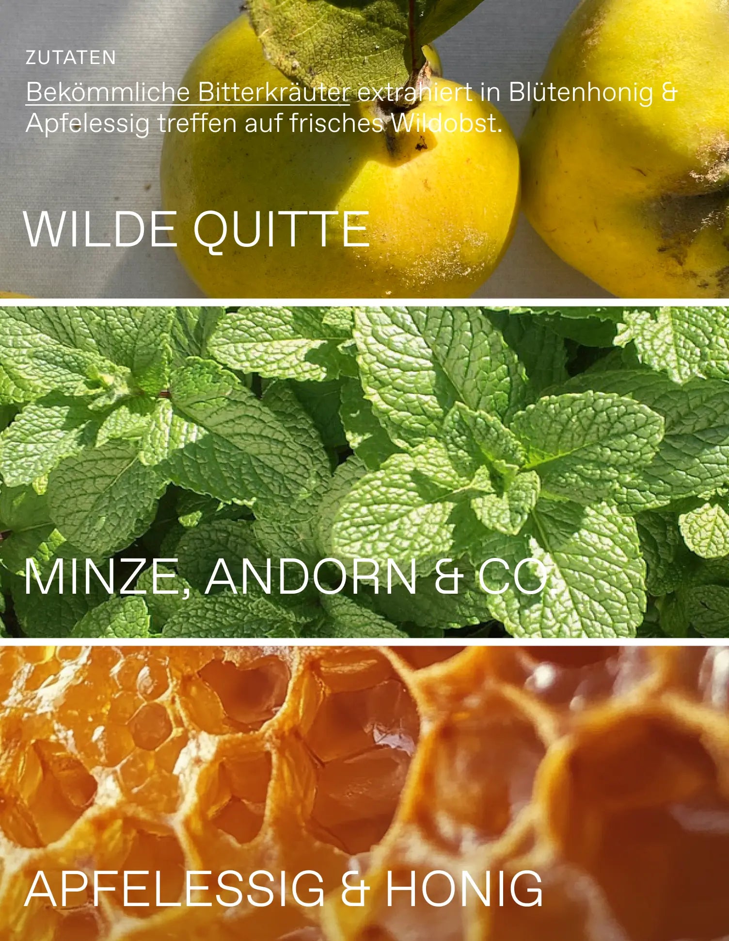 - Quitte und natürliche Bitterstoffe ready-to-drink. Leckerer Quittensaft trifft auf unser hochkonzentriertes Bitter-Elixier mit Minze, Andorn & Co.