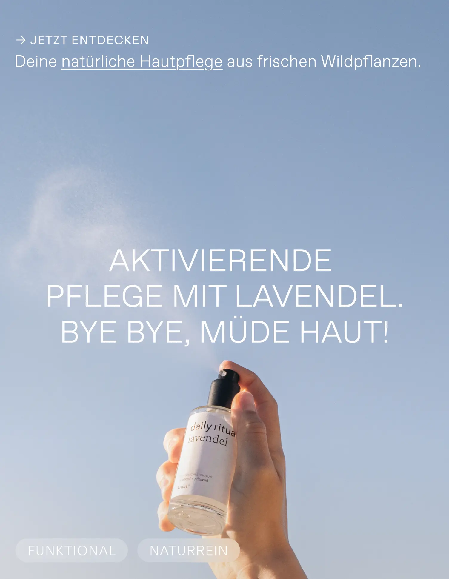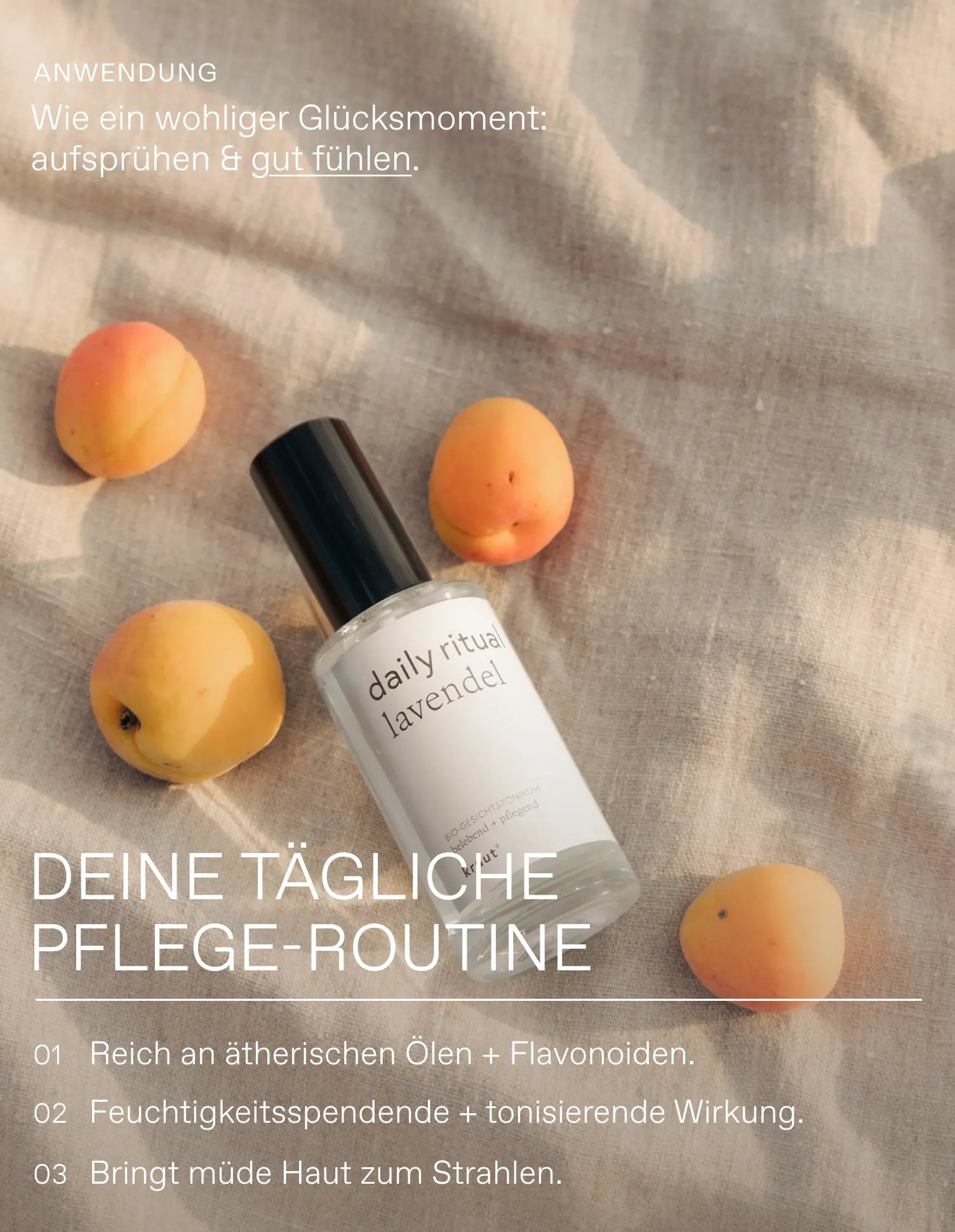In unserem Daily Ritual Face Tonic trifft deutscher Demeter-Lavendel auf die Kraft von Kamille, Pfefferminze und Rose. So entsteht ein einzigartiges, pflegendes Blütenwasser, das deine Haut aktiviert, ihr Feuchtigkeit spendet und einen frischen Glow schenkt. Perfekt als duftende und wohltuende Auszeit zwischendurch. Die ideale Kombination aus Aromatherapie und Naturkosmetik!