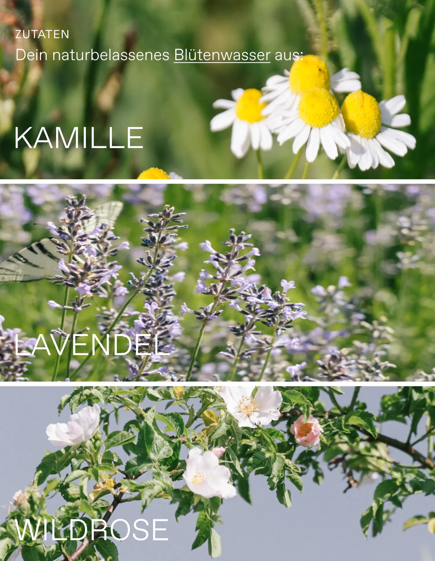 Lavandula Angustifolia Flower Water (Lavendel, demeter)1, Rosa Damascena Flower Water (Rose)1, Anthemis Nobilis Flower Water (Kamille)1, Mentha Piperita Water (Pfefferminz)1, Parfum (demeter)1,2, Citronellol1,2, Geraniol1,2, Limonene1,2, Linalool1,2