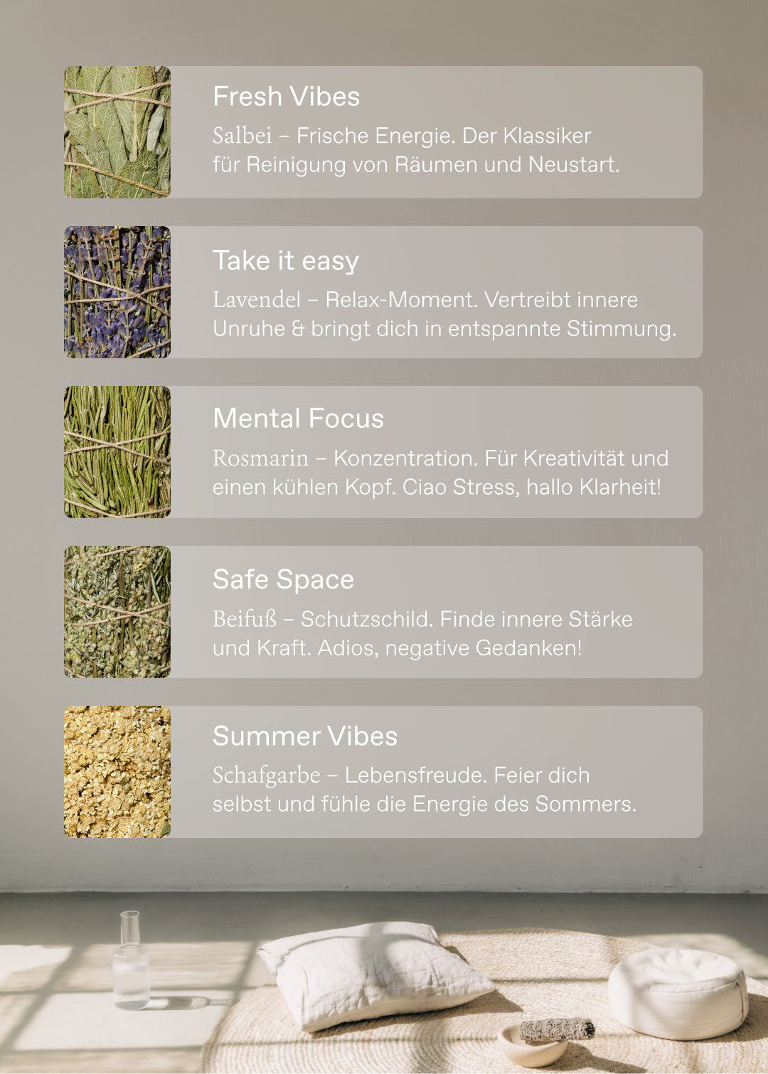- Fünf kraftvolle Räuchermischungen für jede Situation. Aromatheraphie mit der Wirkung von Salbei, Lavendel, Rosmarin, Beifuß und Schafgarbe.
