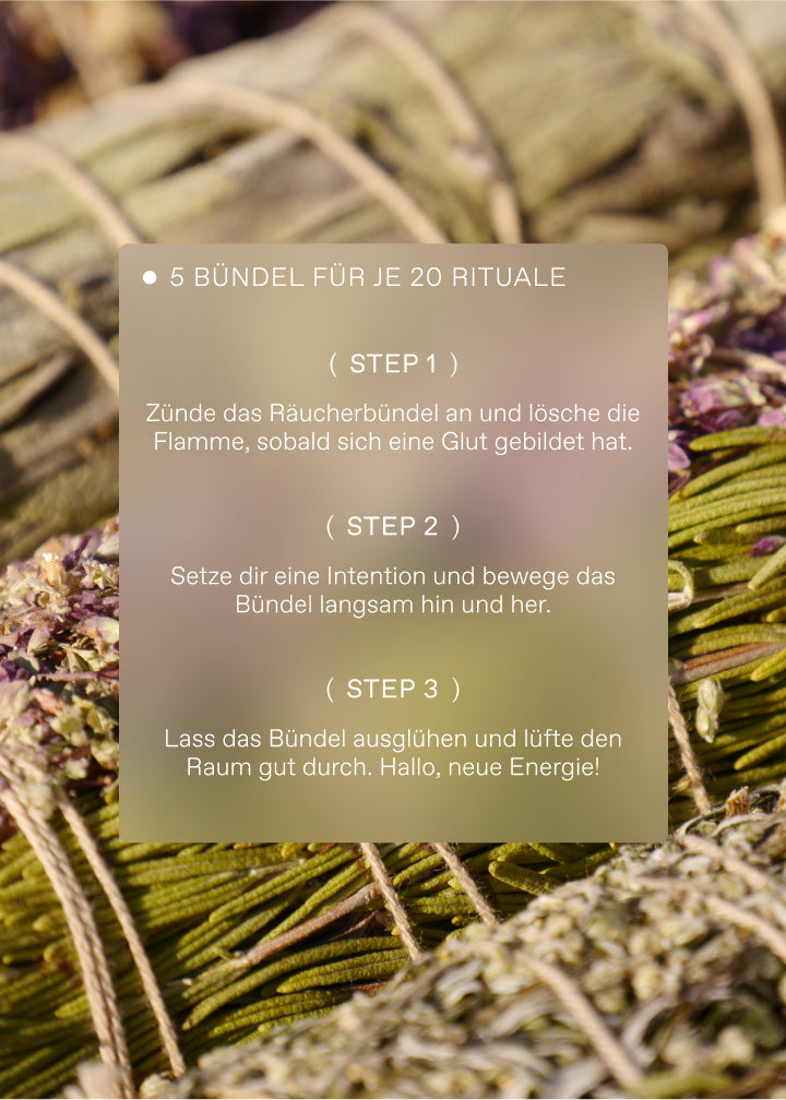 - Für mehr als 100 Anwendungen. Jedes der fünf Bündel reicht für mehr als 20 Rituale und hat eine Brenndauer von mind. 60 Minuten. Ein Bündel ist ca. 12,9x3,5cm groß.