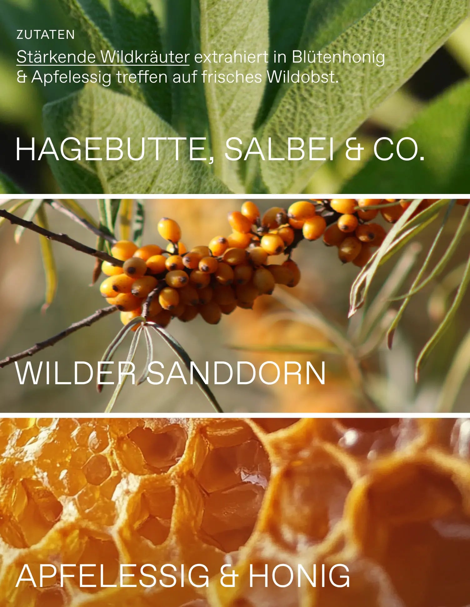 So einfach geht Immun-Support1 für unterwegs!1 In unseren Shots kombinieren wir unser hochkonzentriertes Elixier - den Immun Oxymel mit stärkendem Salbei, Quendel und Spitzwegerich - mit fruchtigem Sanddornsaft, Acerola und frischem Quellwasser. Die lokale Alternative zu Ingwer-Shots & Co.!