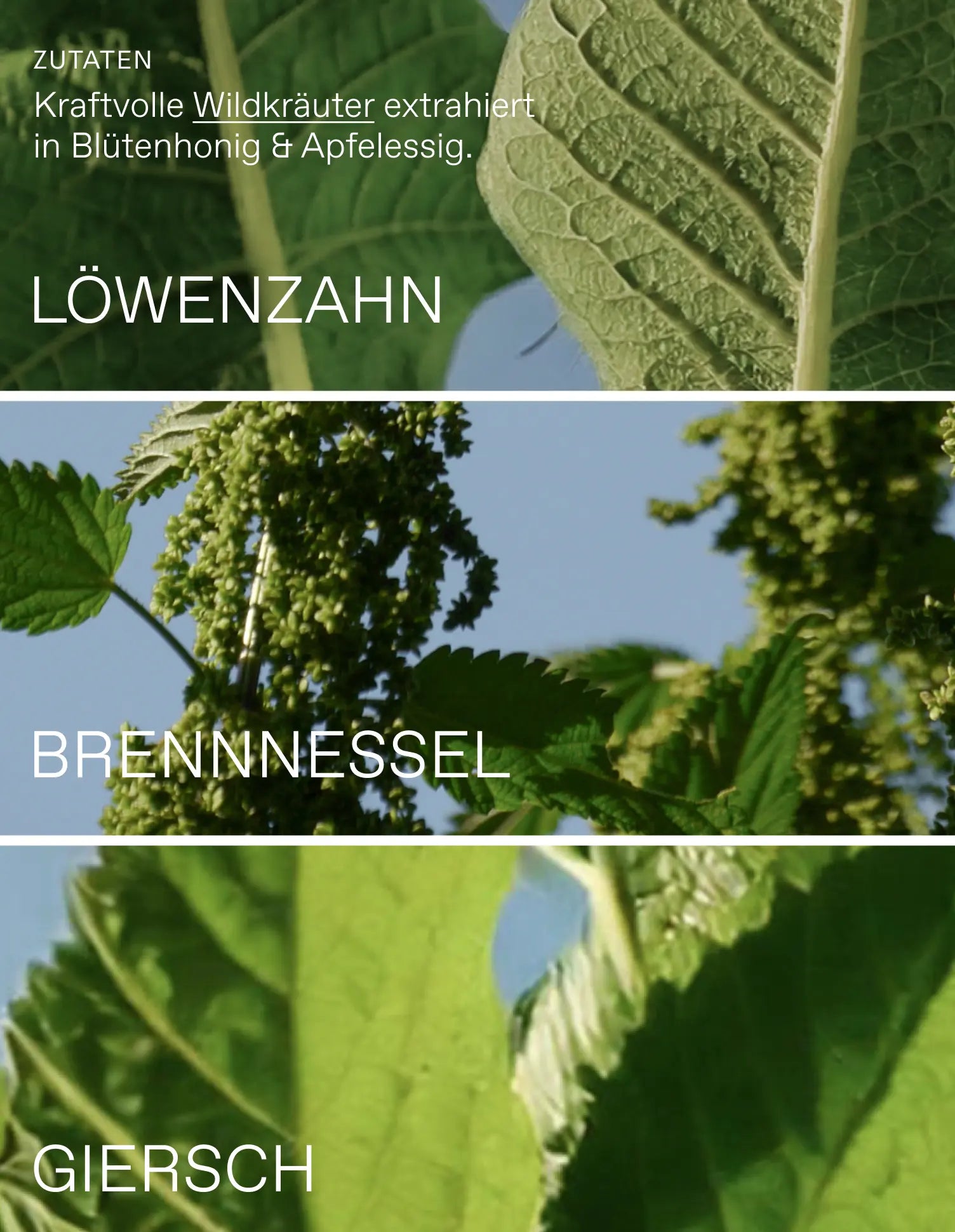 - Deine Stärkung¹ mit kraftvoll frischen Wildkräutern. Giersch, Brennnessel, Löwenzahn und Rotklee.