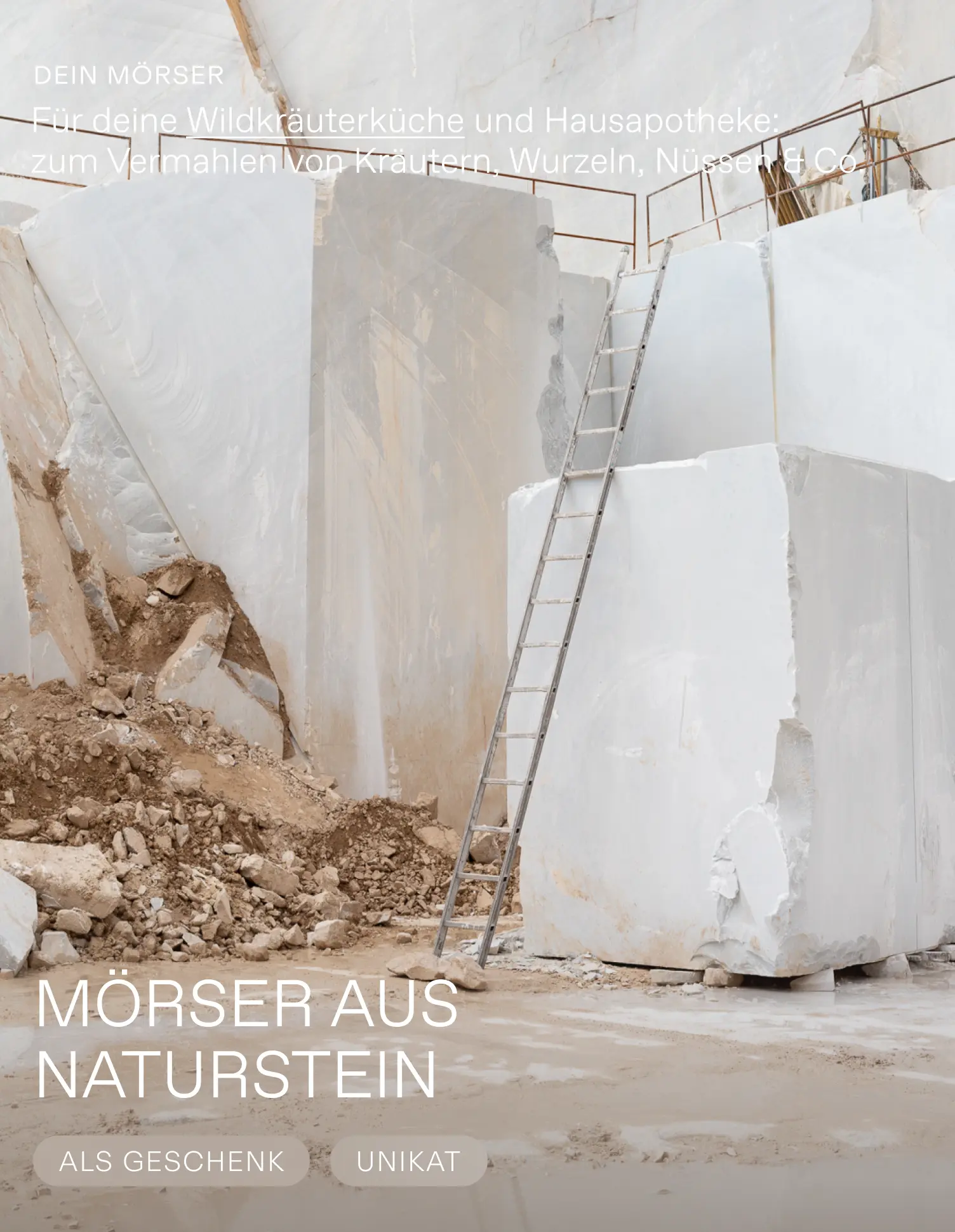 Ein guter, ehrlicher Mörser ist eines der wichtigsten Utensilien in der eigenen Kräuterküche. Langlebig, aus rohem Naturstein und ohne versteckte Chemikalien. Zusammen mit einem österreichischen Meisterbetrieb haben wir unseren idealen Mörser entwickelt: ein echtes Unikat. In etwa zwei Stunden wird dieser von Hand aus robustem, dreihunderttausend Jahre altem Sedimentstein geschliffen.