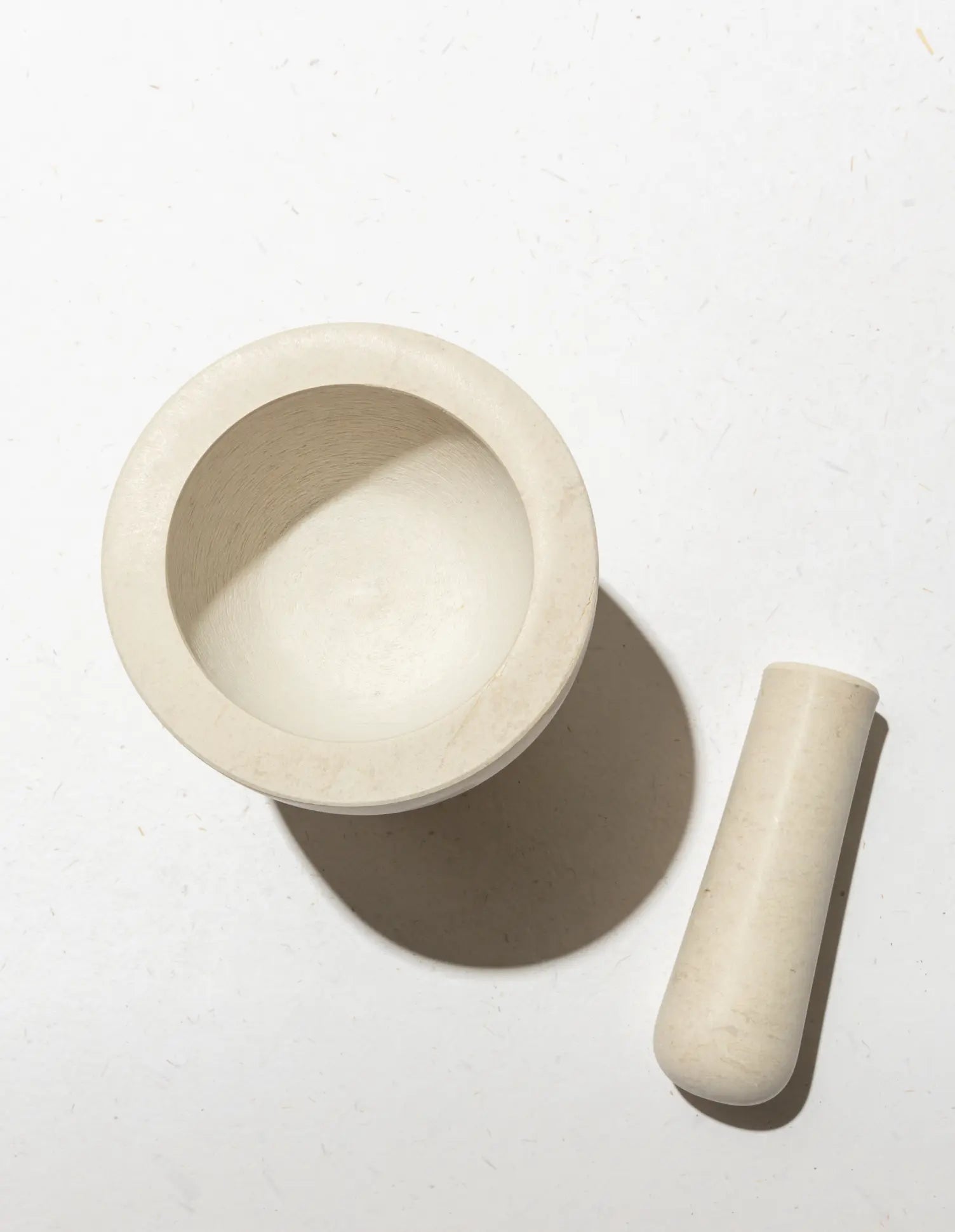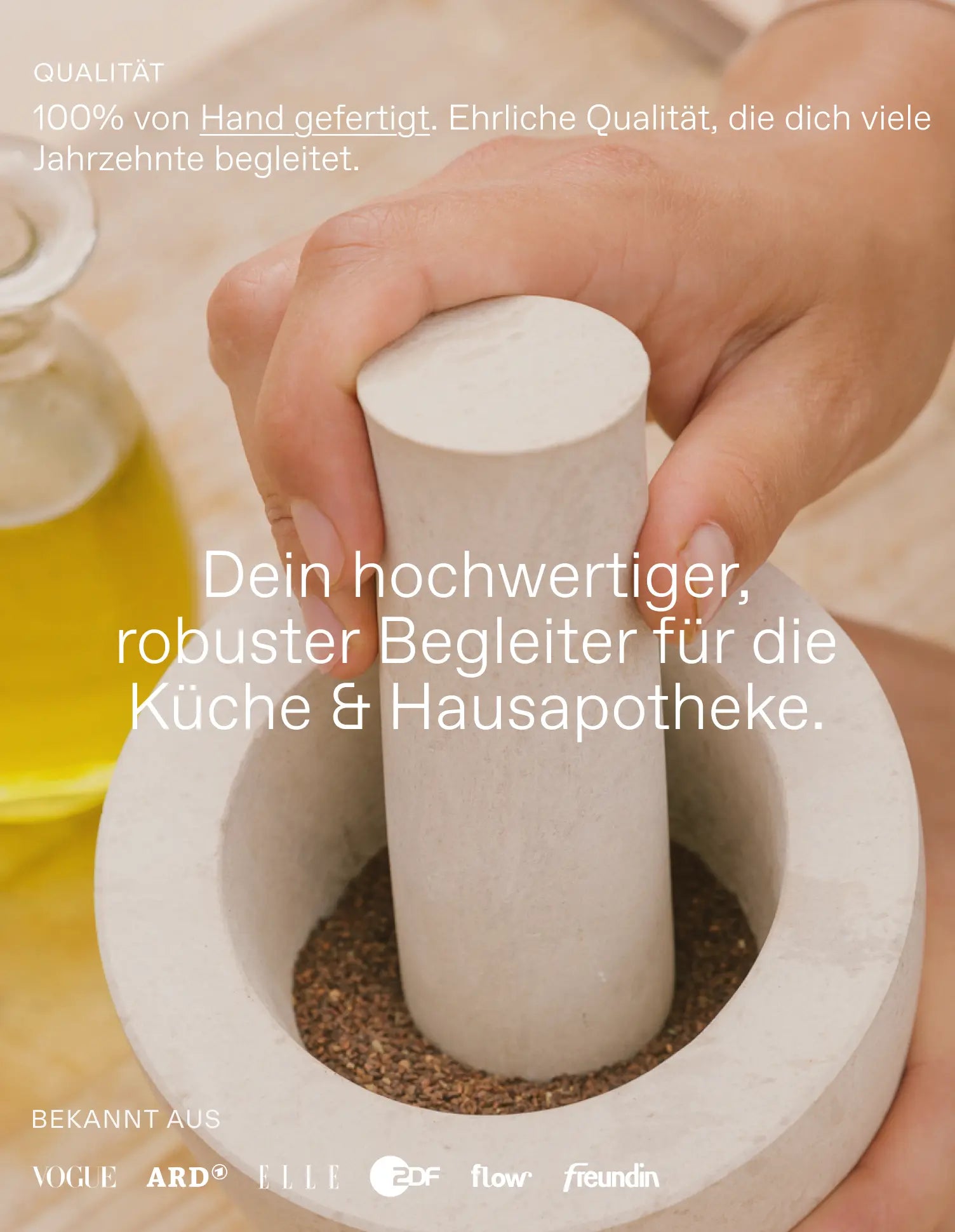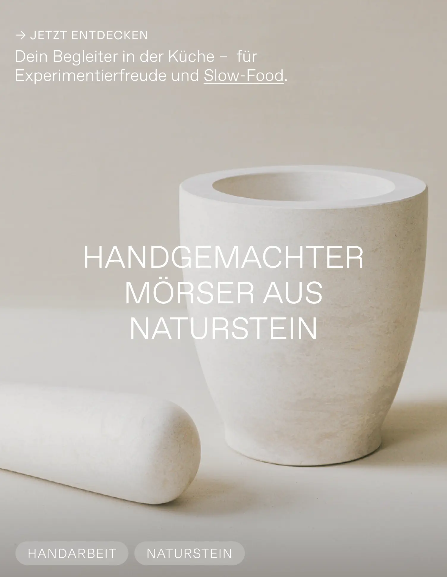 Wir wollten einen ehrlichen Mörser - ohne Zusatzstoffe. Klingt verrückt, ist aber ein großes Problem. 99% aller Mörser auf den Markt enthalten Chemikalien. Sie bestehen aus Gesteinsabfällen, die mit Klebstoffen in eine Form gepresst werden. Beim Mörsern lösen sich diese Stoffe und gelangen in unser Essen. Unser Mörser wird aus einem ganzen Gesteinsblock geschliffen und enthält so keinerlei Chemikalien. Außerdem finden wir, dass er in der Küche eine sehr gute Form abgibt.