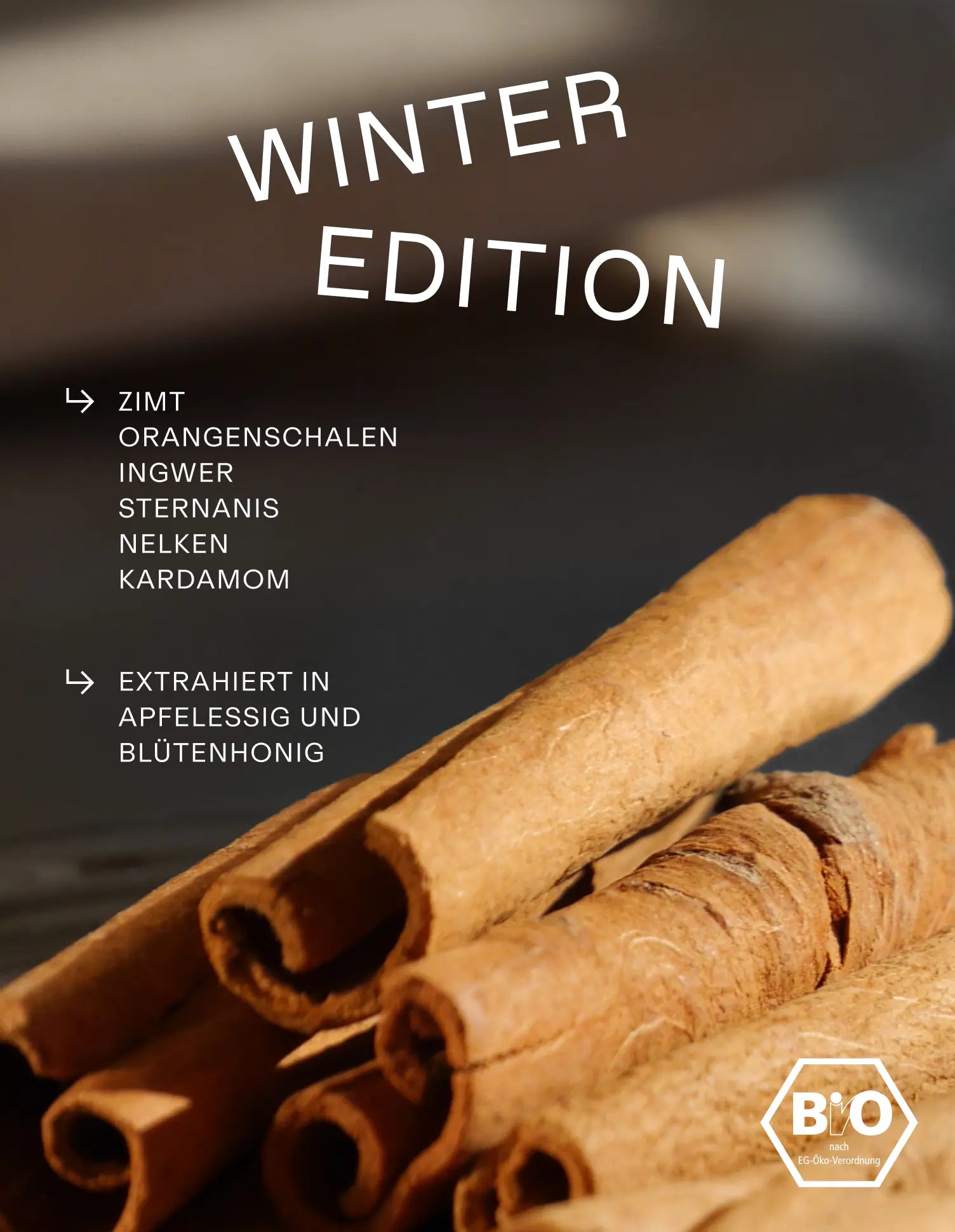 Wildkräuter & Gewürze: Zimt, Orangenschalen, Ingwer, Sternanis, Nelken, Kardamom.