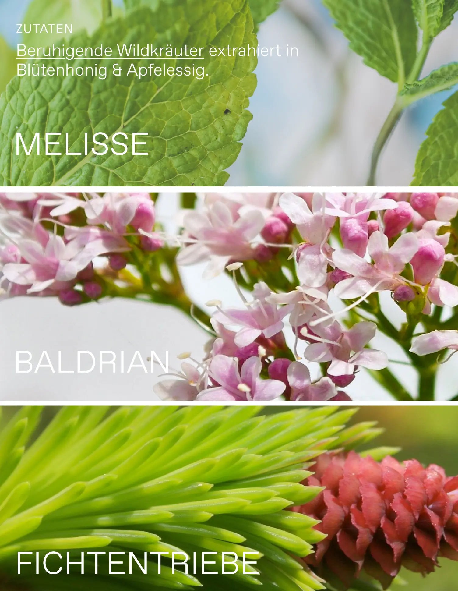 Zutatenverzeichnis. 100% bio: Blütenhonig, naturtrüber Apfelessig, Melisse, Haferkraut, Baldrianwurzel, Fichtentriebe