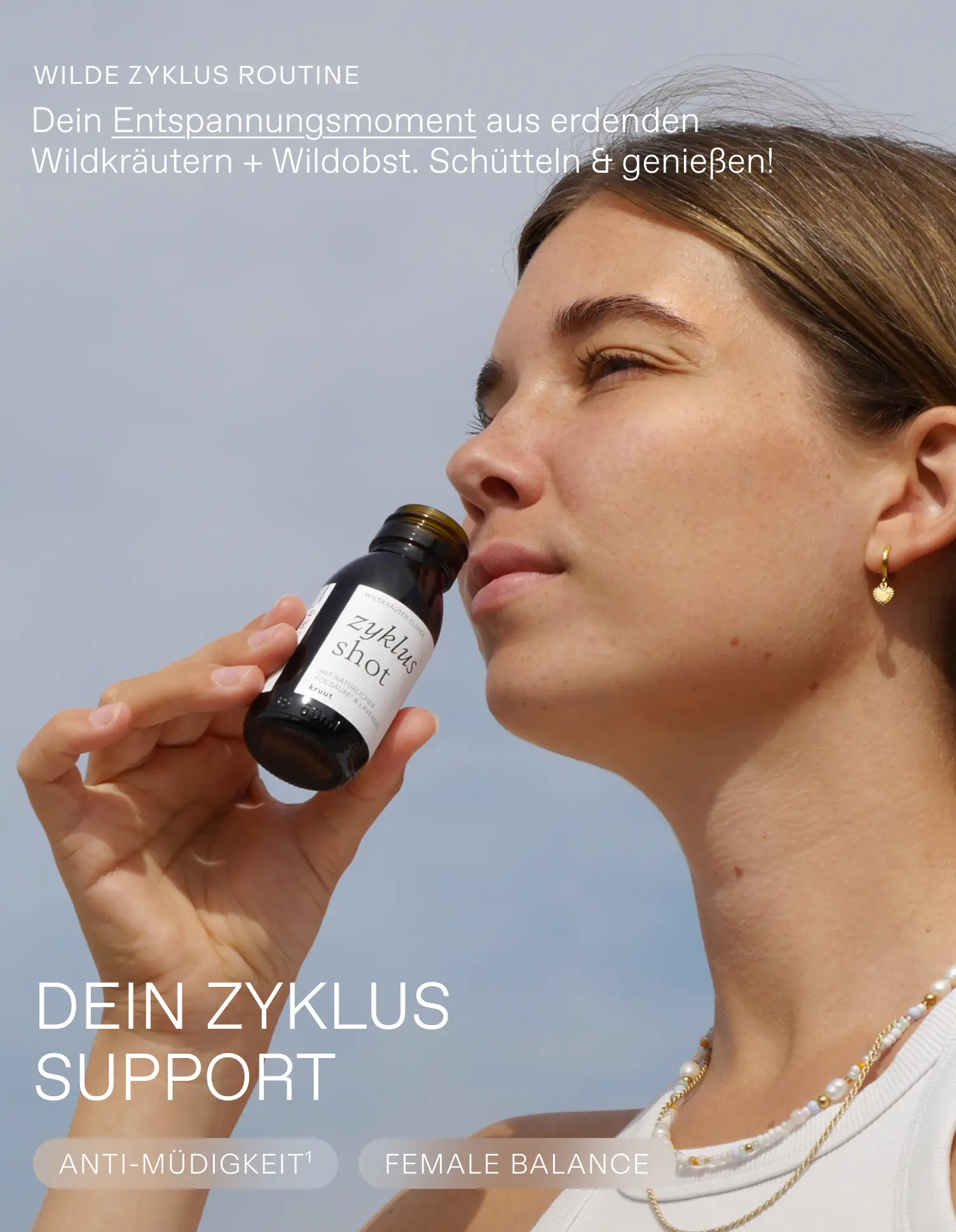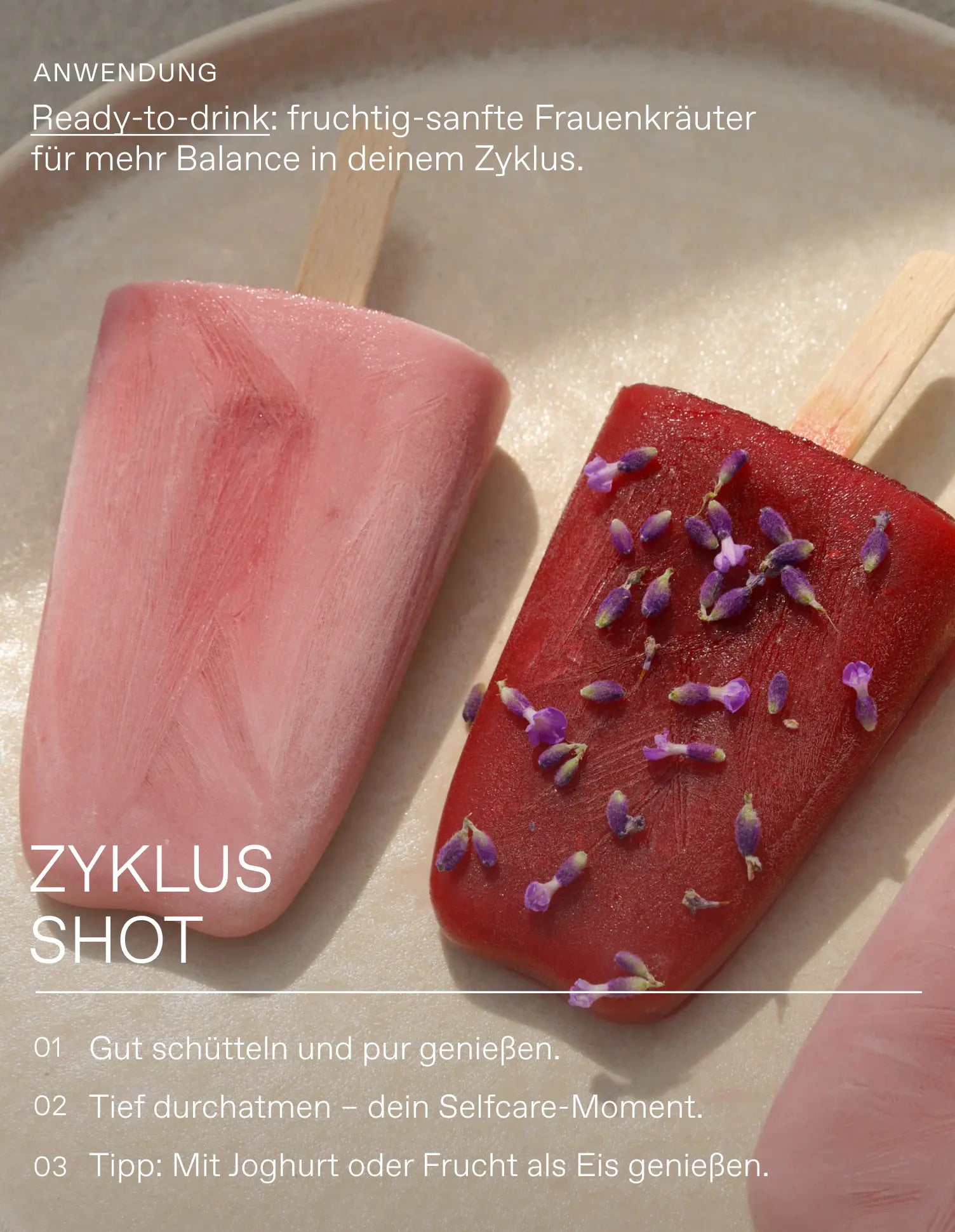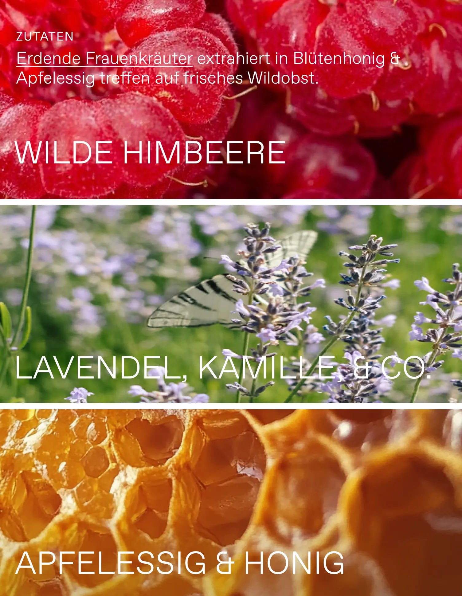 Dein Periodenbegleiter mit Frauenmantel, Lavendel & Co. + Himbeeren. In unseren Shots kombinieren wir unsere hochkonzentrierten Wildkräuter-Auszüge mit fruchtigem Wildobst aus der Region und frischem Quellwasser. 100% Natur ohne Zusatzstoffe oder künstliche Extrakte.